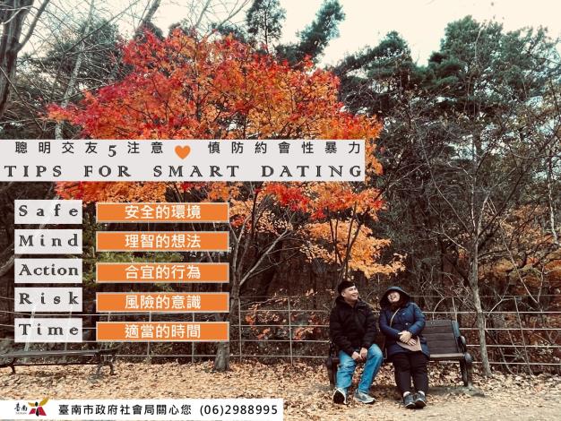 盧局長指出,為有效提升約會安全意識,社會局提供「聰明約會五妙招(SMART)」作為指引,包含:安全的環境(Safe)、理智的想法(Mind)、合宜的行為(Action)、風險的意識(Risk)、合適的時間(Time)。另為避免陷入性影像危機,也提醒市民朋友遵守「三不四要」原則:「三不」不拍攝私密部位、不分享裸露照片、不隱忍惡意威脅;「四要」要求助、要蒐證、要報警、要移除,以避免在浪漫的氛圍中陷入危機。