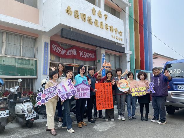 社會局自105年起持續培力在地社區及鄰里組織主動參與性別暴力初級預防工作,迄113年底已有36個社區組織參與,包括4個領航社區、10個宣導社區及22個跨步社區。其中,南區明德社區及大內區環湖社區等2個領航社區代表南市參與衛生福利部113年紫絲帶社區初級預防認證獎勵計畫,於今(114)年初榮獲衛生福利部1朵紫絲帶認證。市長黃偉哲特別贈紅榜祝賀,鼓舞社區持續往2朵紫絲帶認證邁進。