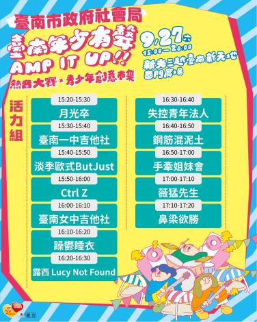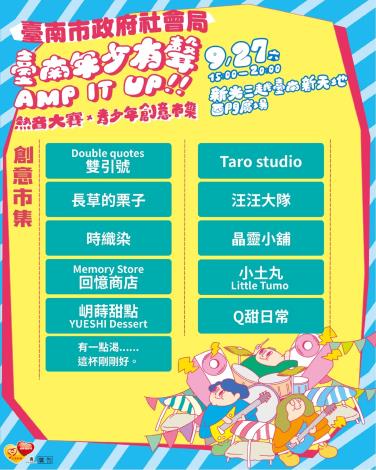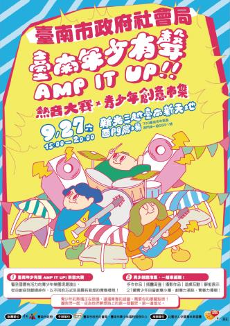 台南市政府長期積極推動《兒童權利公約》(CRC),並透過多元活動宣導青少年「休閒、文化與參與」的權利。今年由社會局與台南市青少年福利服務中心首次以音樂與創意市集為主題,舉辦「臺南年少有聲 AMP IT UP!」,將於 9 月 27 日(星期六)下午 3 點在新光三越台南新天地西門廣場熱鬧登場。此次活動更吸引來自屏東、高雄、雲林、新北、嘉義、台中及台北等 7 個縣市的青少年組隊參與,與台南在地青年交流互動,共同展現跨縣市的青春能量。