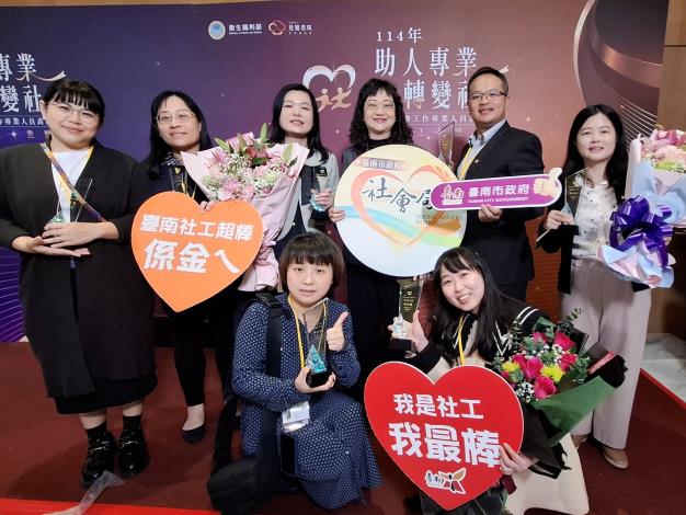 衛生褔利部為肯定社工夥伴在工作上的付出,昨(31)日在台北舉辦「114年全國社會工作專業人員表揚典禮」,臺南市公私部門共有13位社工人員獲衛生福利部表揚,社會局郭乃文局長代表黃偉哲市長向台南市得獎社工致贈祝賀花束,感謝台南市的社工夥伴長期在社福崗位上的辛勞付出,並社褔所有社工4月2日全國社工日快樂。