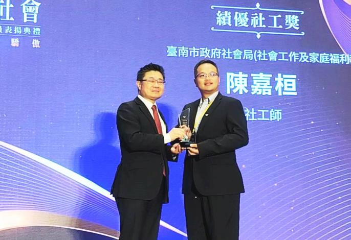 獲「績優社工獎」的臺南市政府社會局陳嘉桓社工師,從事社工服務近10年,他從社會安全網計畫啟動初期就進入社會局擔任社工員,提供脆弱家庭服務,他表示社會工作充滿挑戰,社工的幫助不一定能讓服務對象獲得改變,但他始終相信每一份努力都有機會帶來改變。這次獲獎的榮譽不只屬於個人,更屬於一路支持他的長官同事與家人朋友們,這是對他社工路上的努力的肯定,更是他未來持續走下去的鼓勵。