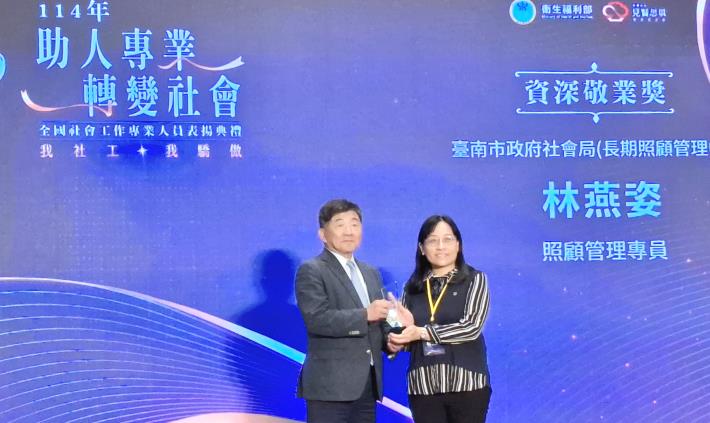 今年臺南市獲得中央表揚的13位公私部門社會工作者中,有4位榮獲「資深敬業獎」服務年資均已屆滿20年以上,分別是社會局林燕姿照顧管理專員、家扶基金會南區分事務所李侑珊社工督導、家扶基金會北區分事務所高于庭資深社工員及陳正梅社工督導。
