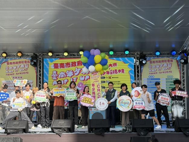 黃偉哲市長親臨現場,受到青少年熱情簇擁並合影留念,氣氛熱烈。市長表示,市府團隊長年來持續陪伴青少年多元成長,並提供展現自我與實踐夢想的舞台。今年的活動不僅讓樂團挑戰自我、爭取榮耀,透過創意市集展現才華與創意,落實CRC所強調的「兒少參與權」與「文化休閒權」。