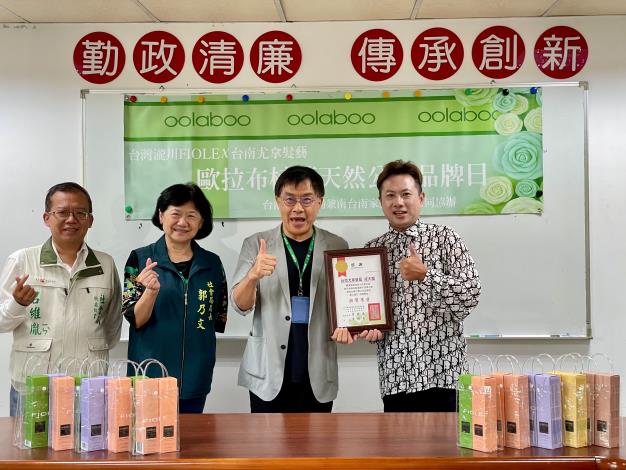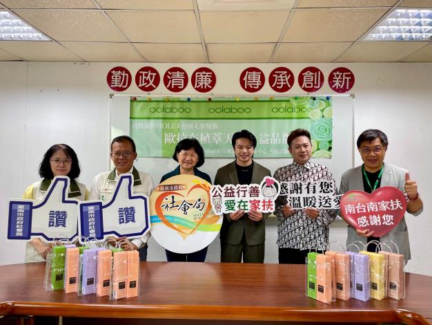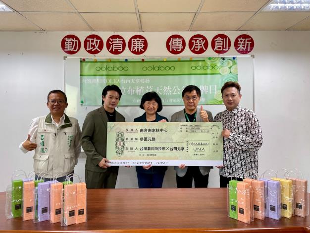 南市社會局(5)日陪同本市在地美髮業者尤拿髮藝成大館及台灣瀧川有限公司秉持「取之於社會,用之於社會」的精神,捐贈新臺幣3萬元予財團法人台灣兒童暨家庭扶助基金會台南市南區分事務所,用於支持弱勢家庭及兒少照顧服務,由社會局長郭乃文及機要秘書呂維胤代表見證。