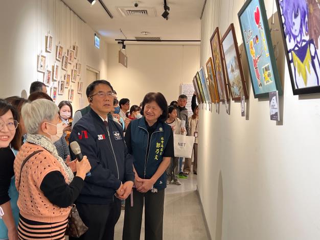 南市黃偉哲市長今(4)日特別利用行程空檔於社會局郭乃文局長陪同下前往南紡購物中心A1館2樓藝廊觀賞知南會所辦理的「藝起精彩,藝起共好-穀粒禾禾,畫話人生藝術展」,社團法人臺南市穀粒禾禾身心關懷協會李靜怡理事長與知南會所的會員們熱忱接待市長,並送上會員手作市長黏土人偶藝術品,感謝市長對於精神障礙朋友的支持與關心。沈震東議員亦到現場致意並予以支持與鼓勵。