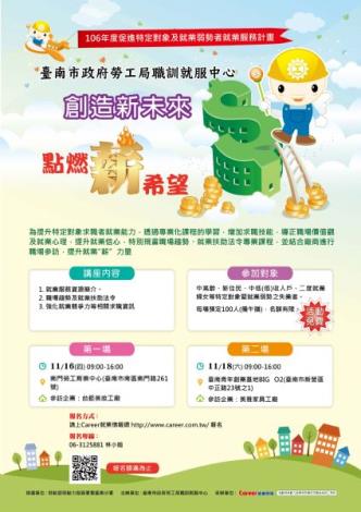 勞工局職訓就服中心11月16日(四)在南門勞工育樂中心、11月18日(六)在台南青年創業基地BIG O2舉辦促進特定對象就業服務活動「創造新未來 點燃薪希望,課程內容有就業服務資源簡介、就業職場趨勢介紹、就業扶助法令專業課程等,並進行企業參訪,提供遊覽車定點接駁,活動全程免費,歡迎報名參加,額滿為止,詳洽:就業情報資訊股份有限公司06-3125881林小姐。