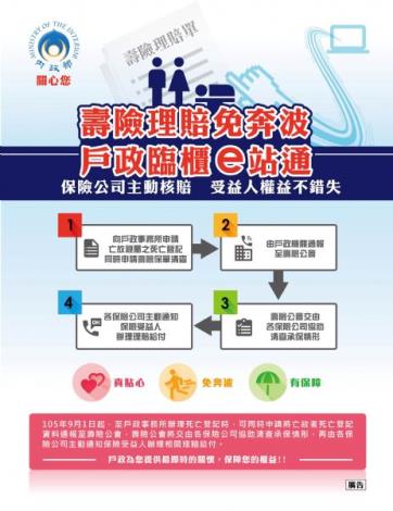 本服務自105年9月1日實施,民眾至戶政事務所辦理死亡登記時,可同時申請將亡故者死亡登記資料通報壽險公會,壽險公會將交由各保險公司協助清查承保情形,再由各保險公司主動通知保險受益人辦理相關理賠給付,免除亡故者之保險受益人因不清楚亡故者生前投保情形,而錯失申請保險理賠之狀況。